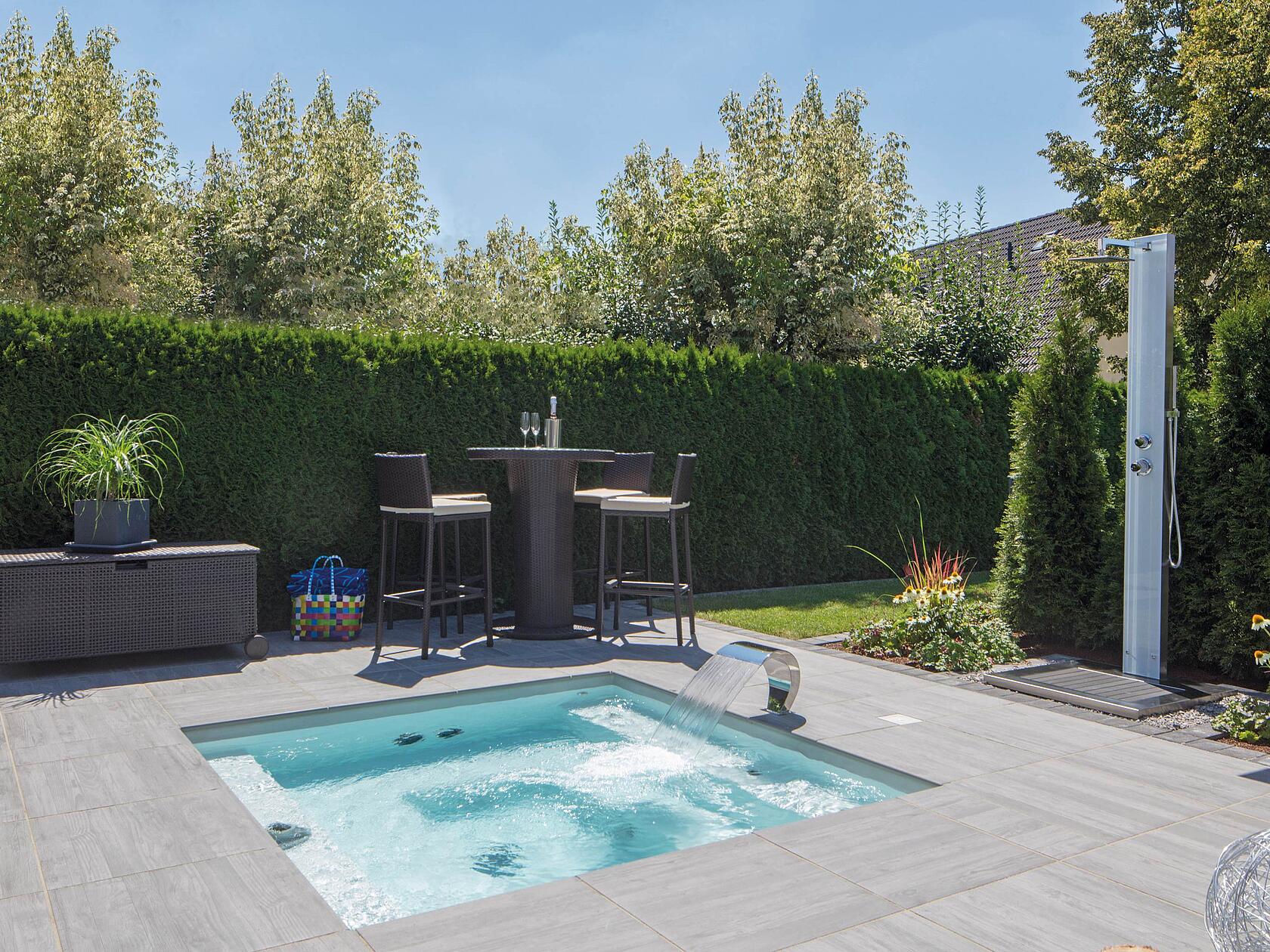 Der kompakte Minipool für die Terrasse: Genug Platz für bis zu 4 Personen oder gemütliches Ausstrecken zu zweit - dieser Pool belebt jede Terrasse und macht daraus eine schicke Aqua-Lounge.